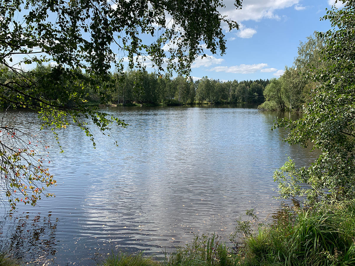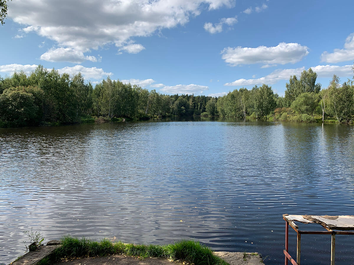 Отсутствие шума от шоссе за счёт трех линий домов деревни Трубино. Проточный купачий Трубинской пруд: не застаивается и не цветёт. Рядом здоровый лес с соснами для прогулок. Рядом магазин "Пятерочка", церковь Сергия Радонежского, школа, больница и поликлиника.